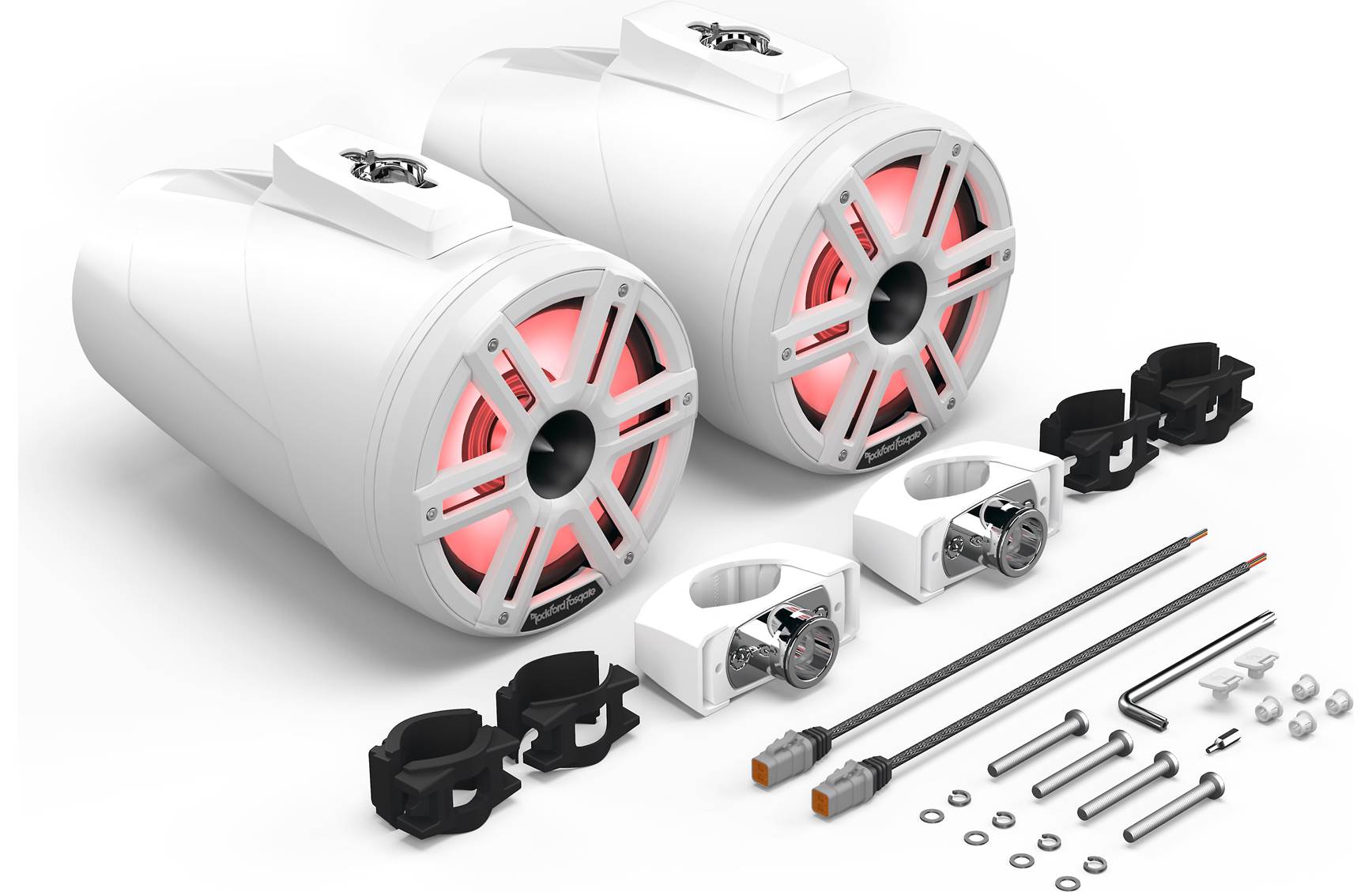 | In the Box | (2) Loaded wake cans, (2) Universal clamps, (4) Grommets, (2) Spare safety inserts for screw clamp, (1) Safety torx wrench, (2) 1.5" to 2.5" rubber inserts and stainless screws, (2) 2.5" to 3" rubber inserts and stainless screws, (2) Stainless steel grilles, (2) Sport grilles, (1) Allen bit for rotating speakers, (2) 6-pin Deutsch wiring harnesses |